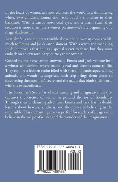 In the heart of winter, as snow blankets the world in a shimmering white, two children, Emma and Jack, build a snowman in their backyard. With a carrot nose, coal eyes, and a warm scarf, their creation is more than just a winter pastime-it's the beginning of a magical adventure. As night falls and the stars twinkle above, the snowman comes to life, much to Emma and Jack's astonishment. With a warm and twinkling smile, he reveals that he has a special secret to share, but they must embark on an extraordinary journey to uncover it. Guided by their enchanted snowman, Emma and Jack venture into a winter wonderland where magic is real and dreams come to life. They explore a hidden realm filled with sparkling landscapes, talking animals, and wondrous surprises. Each step brings them closer to discovering the snowman's secret and the magic that binds their world with the extraordinary. "The Snowman's Secret" is a heartwarming and imaginative tale that captures the essence of winter magic and the joy of friendship. Through their enchanting adventure, Emma and Jack learn valuable lessons about bravery, kindness, and the power of believing in the impossible. This enchanting story is perfect for readers of all ages who believe in the magic of winter and the wonders of the imagination.