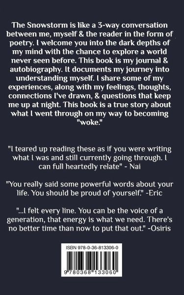 The Snowstorm is like a three way conversation between me, myself and the reader in the form of poetry. I welcome you into the dark depths of my mind with the chance to explore a world never seen before. This book is my journal and autobiography. It documents my journey into understanding myself. I share some of my experiences, along with my feelings, thoughts, connections I've drawn, and questions that keep me up at night. This book is a true story about what I went through on my way to becoming woke.