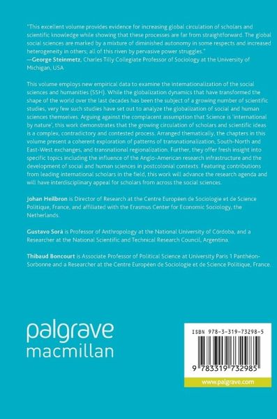 Introduction: The Social and Human Sciences in Global Power Relations; Johan Heilbron, Thibaud Boncourt, Gustavo Sorá.- Part I. Patterns of Transnationalization.- 1: The Globalization of European Research in the Social Sciences and Humanities (1980-2014): A Bibliometric Study; Johan Heilbron, Yves Gingras.- 2: What Factors Determine the International Circulation of Scholarly Books? The Example of Translations between English and French in the Era of Globalization; Gisèle Sapiro.- 3: What "Internationalization" Means in the Social Sciences. A Comparison of the International Political Science and Sociology Associations; Thibaud Boncourt.- Part II. Transnational Regionalization.- 4: Unity and Fragmentation in the Social and Human Sciences in Latin America; Gustavo Sorá, Alejandro Blanco.- 5: The European Research Area in the Social and Human Sciences: Between National Closure and American Hegemony; Johan Heilbron, Thibaud Boncourt, Rob Timans.- Part III. South-North Relations.- 6: The Postcolonial Internationality of Algerian Academics; Tristan Leperlier.- 7: The Internationalization of Sociology in Argentina, 1985-2015: Geographies and Trends; Alejandro Blanco, Ariel Wilkis.- 8: The Ford Foundation and the Institutionalization of Political Science in Brazil; Leticia Canêdo.- 9: Translating Western Social and Human Science in Argentina. A Comparative Study of Translations from French, English, German, Italian and Portuguese; Gustavo Sorá, Alejandro Dujovne.- Part IV. East-West Relations.- 10:A Case of State Controlled Westernization. Foreign Impacts in the Hungarian Social Sciences (1945-2015); Victor Karady, Peter Tibor Nagy.- 11: Western References in Asian Social Sciences (Japan and South Korea); Thomas Brisson, Laurent Jeanpierre, Kil-ho Lee.