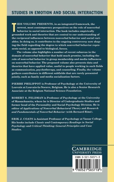This volume presents, in an integrated framework, the newest, most contemporary perspectives on the role of nonverbal behavior in social interaction. The book includes empirically-grounded work and theories that are central to our understanding of the reciprocal influences between nonverbal behavior and social variables.