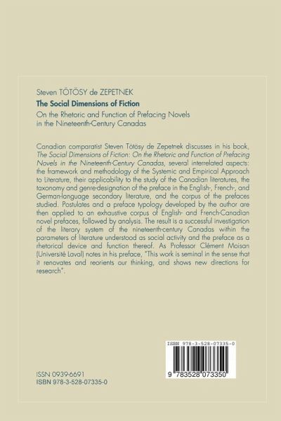 This work is a comparative study of nineteenth-century English-Canadian and French Canadian novel prefaces, a previously unexplored literary topic. As a study in Comparative Literature - with the application of a specific literary framework and methodology - the study conforms to theoretical and methodological postulates formulated in and prescribed by this framework when applied. This a priori postulate necessitates that the research on and the presentation of the Canadian novel preface be carried out in a specific manner, as follows. First, the study will establish the hypothesis that the preface to nineteenth-century English-Canadian and French-Canadian novels is a genre in its own right. This hypothesis will rest on the following: 1) a taxonomical survey of related terms meaning "preface"; 2) a survey of secondary Iiterature of works dealing with the preface; 3) a discussion of the theoretical framework and methodology of the Empirical Theory of Literature and its appropriateness for the study of the preface; and 4) a discussion of the process of the compilation of the corpus of nineteenth-century Canadian novel prefaces (Chapter one). In a second step, the theoretical postulate outlined in the hypothesis will be put into practice by the development and production of a preface typology (Chapter two). In a third step, further tenets of the Empirical Theory of Literature will be tested on the corpus of the prefaces (Chapter three). In a fourth step, the prefaces will be analysed following the tenets formulated in and prescribed by the systemic framework applied (Chapter four).
