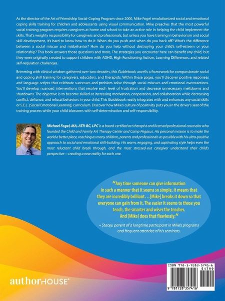 Brimming with clinical wisdom gathered over two decades, this Guidebook unveils a framework for compassionate social and coping skill training for caregivers, educators, and therapists. The strategies you encounter here can benefit any child, but they were originally created to support children with ADHD, mild Autism, learning differences, and related self-regulation challenges. You'll discover positive responses and language-scripts that celebrate successes and problem-solve social miscues and emotional overreactions. You'll develop nuanced interventions that resolve each level of frustration and decrease unnecessary meltdowns and shutdowns. The objective is to become skilled at increasing motivation, cooperation, and collaboration while decreasing conflict, defiance, and refusal behaviors in your child. This Guidebook neatly integrates with and enhances any social skills or S.E.L. (Social Emotional Learning) curriculum. Discover how Mike Fogel's culture of positivity puts you in the driver's seat of the training process while your child blossoms with self-determination and self-responsibility. As the director of the Art of Friendship Social-Coping Program since 2000, Mike revolutionized social and emotional coping skills training for children and adolescents using visual communication. Mike preaches that the most powerful social training program requires caregivers at home and school to take an active role in helping the child implement the skills. That's weighty responsibility for caregivers and professionals, but unless you have training in behaviorism and social skill development, it's hard to know how to do it. When do you push and when do you back off? What's the difference between a social miscue and misbehavior? How do you help without destroying your child's self-esteem or your relationship? This book answers those questions and more with compassion and optimism.