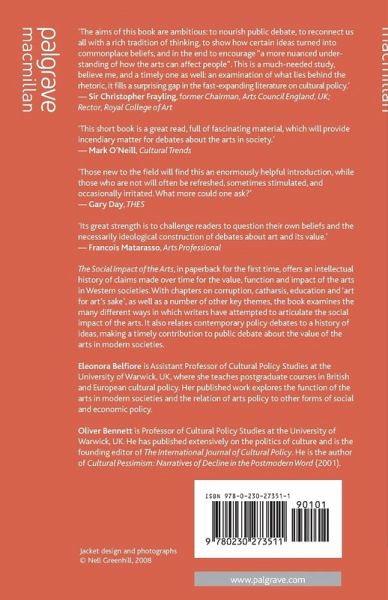 'It is...a pity that the humanities did not take earlier and more confident steps to marshal the wide range of research already carried out into claims made for the social use of the arts into comprehensive surveys like the present, superlative, "intellectual history" by Eleanora Belfiore and Oliver Bennett... The book's compass and ambition is nothing short of humbling, ranging as it does from Plato to postmodernism, across a range of performative, literary and fine arts, both "high" and "low", and responding to a variety of claims that have been made against, as well as for, the arts... This is managed with exemplary, jargon-free clarity that sacrifices nothing of the sophistication of thought and makes the book an excellent choice for students... One hopes that undergraduate courses in all branches of historical cultural enquiry are able to find room to accommodate such wide-angle approaches to their subjects... Highly recommended to all undergraduate students of the arts." - Chris Jones, THE Textbook Guide