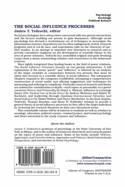 Social psychologists have always been concerned with two-person interactions and the factors enabling one person to gain dominance. Although social psychology has devised a revolutionary set of techniques to investigate the phenomenon of power, hypotheses are too often ambiguously stated, research programs end in cul-de-sacs, and experiments take on the character of one-shot studies. In an attempt to stimulate new directions in research and to provide cumulative emphasis on the development of scientific theory in the area of power relations, Tedeschi has assembled original and path breaking essays from a dozen outstanding scholars and researchers in the behavioral sciences. More tightly integrated than leading books in the field of power relations, The Social Influence Processes focuses on two-person interactions. A full explanation of the terms "power" and "influence" is followed by an analysis of the major variables in connections between two persons that must be taken into account in a scientific theory of social influence. The subsequent chapters respond to the categories established, attempting a comprehensive construction of social reality and offering suggestions and techniques for measuring and ordering its complexity. Particular areas of research and theory are isolated for consideration in depth--such topics as personality as a power construct (Power and Personality by Henry L. Minton), influence in exchange theory (The Tactical Use of Social Power by Andrew Michener and Robert W. Suchner), and leadership through charisma (Interpersonal Attraction and Social Influence by Elaine Walster and Darcy Abrahams). In the final chapter, Tedeschi, Thomas Bonoma, and Barry R. Schlenker attempt to provide a general theory of social influence processes as they affect the target individual by reviewing the research literature in their own theoretical terms. This remarkable volume will be of interest to students as well as scholars in sociology, education, political science, criminal justice, and social psychology and those interested in the study of power and influence.