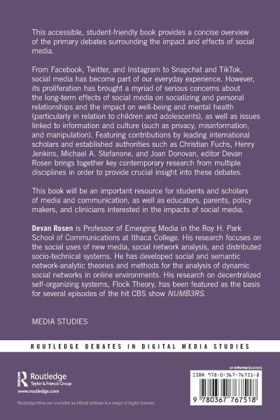 From Facebook, Twitter, and Instagram to Snapchat and TikTok, social media has become part of our everyday experience. However, its proliferation has brought a myriad of serious concerns about the long-term effects of social media on socializing and personal relationships and the impact on well-being and mental health (particularly in relation to children and adolescents), as well as issues linked to information and culture (such as privacy, misinformation, and manipulation). Featuring contributions by leading international scholars and established authorities such as Christian Fuchs, Henry Jenkins, Michael A. Stefanone, and Joan Donovan, editor Devan Rosen brings together key contemporary research from multiple disciplines in order to provide crucial insight into these debates.