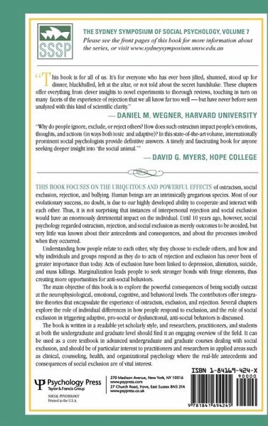 This book focuses on the ubiquitous and powerful effects of ostracism, social exclusion, rejection, and bullying. Human beings are an intrinsically gregarious species. Most of our evolutionary success is no doubt due to our highly developed ability to cooperate and interact with each other. It is thus not surprising that instances of interpersonal rejection and social exclusion would have an enormously detrimental impact on the individual. Until 10 years ago, however, social psychology regarded ostracism, rejection and social exclusion as merely outcomes to be avoided, but we knew very little about their antecedents and consequences, and about the processes involved when they occurred. Furthermore, the literatures of ostracism, social exclusion and rejection have not until now included discussions of the bullying literature.