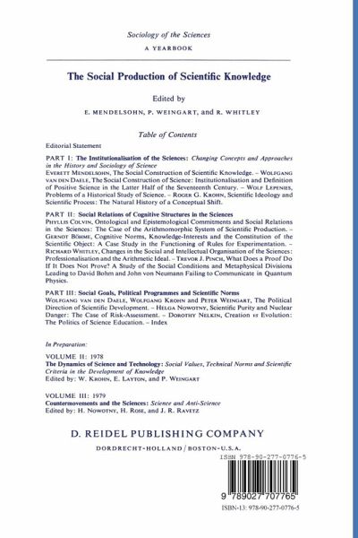 I: The Institutionalisation of the Sciences: Changing Concepts and Approaches in the History and Sociology of Science.- The Social Construction of Scientific Knowledge.- The Social Construction of Science: Institutionalisation and Definition of Positive Science in the Latter Half of the Seventeenth Century.- Problems of a Historical Study of Science.- Scientific Ideology and Scientific Process: The Natural History of a Conceptual Shift.- II: Social Relations of Cognitive Structures in the Sciences.- Ontological and Epistemological Commitments and Social Relations in the Sciences: The Case of the Arithmomorphic System of Scientific Production.- Cognitive Norms, Knowledge- Interests and the Constitution of the Scientific Object: A Case Study in the Functioning of Rules for Experimentation.- Changes in the Social and Intellectual Organisation of the Sciences: Professionalisation and the Arithmetic Ideal.- What Does a Proof Do If It Does Not Prove? A Study of the Social Conditions and Metaphysical Divisions Leading to David Bohm and John von Neumann Failing to Communicate in Quantum Physics.- III: Social Goals, Political Programmes and Scientific Norms.- The Political Direction of Scientific Development.- Scientific Purity and Nuclear Danger: The Case of Risk-Assessment.- Creation vs Evolution: The Politics of Science Education.
