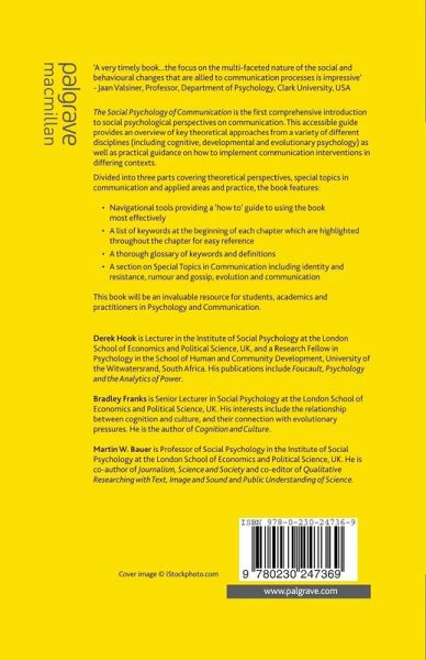 Glossary of Keywords and Definitions Introduction: The Social Psychology of Communication: Towards an 'Inter-Field' Approach; D.Hook & B. Franks PART I: INTRODUCING THE SOCIAL PSYCHOLOGY OF COMMUNICATIONThe Developmental Impact of Communicative Interaction; J.Hardman Dialogue, Critical Consciousness and Praxis; C.Vaughan Non-verbal Communication and Culture; A.de-Graft Aikins Social Influence: Modes and Modalities; G.Sammut & M.Bauer Pragmatic Theory and Social Relations; B.Franks & H.Green Communicative Action and the Dialogical Imagination; S.Jovchelovitch PART II: SPECIAL TOPICS IN COMMUNICATIONIdentity and Resistance in Communication; C.Howarth Rumours and Gossip as Genres of Communication; B.Franks & S.Attia Empty and Full Speech; D.Hook Argument and Rhetoric; V. Glaveanu with M.Bauer Evolution and Communication; B.Franks & J.Dhesi PART III: APPLIED AREAS AND PRACTICE Religion as Communicative Action; E.Arens Media Health Campaigns: From Information to Social Change; C.Campbell & K.Scott Social Psychology of Political Communication; M.C.Nisbet & L.Feldman Science Communication; J.Gregory