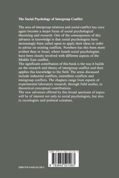 I. Introduction.- 1 Psychological Processes in Intergroup Conflict.- II. Cognitive and Motivational Bases of Conflict.- 2 Judgmental Processes as Bases of Intergroup Conflict.- 3 Attributional Bases of Intergroup Conflict.- 4 Conflict as a Cognitive Schema: Toward a Social Cognitive Analysis of Conflict and Conflict Termination.- III. The Maintenance of Conflict.- 5 Social Identity and Intergroup Conflict: An Israeli view.- 6 Political Terrorism: A Social Psychological Perspective.- IV. The Resolution of Conflict.- 7 Bargaining and Arbitration in the Resolution of Conflict.- VIII Table of Contents.- 8 Negotiating with Terrorists.- 9 Intergroup Contact, Cultural Information, and Change in Ethnic Attitudes.- 10 Familiarity May Breed Contempt: The Impact of Student Exchange on National Stereotypes and Attitudes.- Author Index.