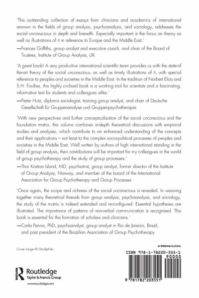 Introduction Theory The concepts of the social unconscious and of the matrix in the work of S. H. Foulkes The fluid and the solid or the dynamic and the static: some further thoughts about the conceptualisation of foundation matrices, processes of the social unconscious, and/or large group identities The national habitus: steps towards reintegrating sociology and group analysis The inner organisation of the matrix Non Verbal Communication The unbearable appeal of totalitarianism and the collective self: an inquiry into the social nature of non verbal communication The musical foundation matrix: communicative musicality as a mechanism for the transmission and elaboration of co created unconscious social processes Empirical Studies of the Social Unconscious and the Dynamic and Foundation Matrices of Middle Eastern Peoples and Societies The social unconscious of Israeli Jews: described and analysed by an Israeli living in North America "Black holes" as a collective defence against shared fears of annihilation in a small therapy group and in its contextual society The social unconscious of the Palestinian people "After the last sky":* Palestine, Palestinians, social memory The social unconscious of the Egyptian people: an application of some of the ideas of Bion and Klein Fundamental terror of ISIS: the story of a reversed family Epilogue