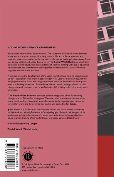 Social work has become a business. The traditional distinction drawn between social work as a non-commercial activity in the public and voluntary sectors of the welfare state and private commercial activities driven by the market's profit motive has largely disappeared. In The Social Work Business John Harris addresses the introduction and consolidation of business thinking and ways of operating in social work and considers the consequences for service users, carers, voluntary organisations and social workers. The book traces the development of the social work business from its establishment under Thatcherism to its modernisation under New Labour. It looks in detail at the use of capitalist sector methods - the heightened use of surveillance, the increase in managerial control, changes in work practices - and how this is being reflected in social work education. The Social Work Business provides a radical reappraisal of the far-reaching changes the profession has undergone. The sources of uneasiness experienced by many social workers, faced with a transformation in the organisational culture in which they work, are thrown into sharp relief and opened up for debate.