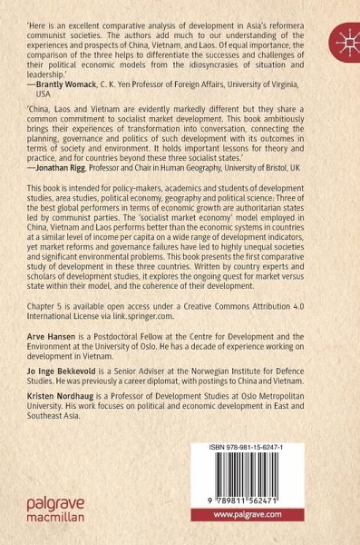 This book is intended for policy-makers, academics and students of development studies, area studies, political economy, geography and political science. Three of the best global performers in terms of economic growth are authoritarian states led by communist parties. The 'socialist market economy' model employed in China, Vietnam and Laos performs better than the economic systems in countries at a similar level of income per capita on a wide range of development indicators, yet market reforms and governance failures have led to highly unequal societies and significant environmental problems. This book presents the first comparative study of development in these three countries. Written by country experts and scholars of development studies, it explores the ongoing quest for market versus state within their model, and the coherence of their development.