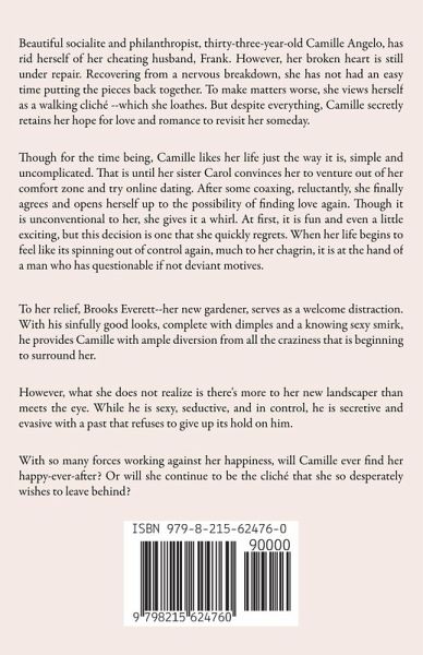 Beautiful socialite and philanthropist, thirty-three-year-old Camille Angelo, has rid herself of her cheating husband, Frank. However, her broken heart is still under repair. Recovering from a nervous breakdown, she has not had an easy time putting the pieces back together. To make matters worse, she views herself as a walking cliché --which she loathes. But despite everything, Camille secretly retains her hope for love and romance to revisit her someday. Though for the time being, Camille likes her life just the way it is, simple and uncomplicated. That is until her sister Carol convinces her to venture out of her comfort zone and try online dating. After some coaxing, reluctantly, she finally agrees and opens herself up to the possibility of finding love again. Though it is unconventional to her, she gives it a whirl. At first, it is fun and even a little exciting, but this decision is one that she quickly regrets. When her life begins to feel like its spinning out of control again, much to her chagrin, it is at the hand of a man who has questionable if not deviant motives. ¿ To her relief, Brooks Everett--her new gardener, serves as a welcome distraction. With his sinfully good looks, complete with dimples and a knowing sexy smirk, he provides Camille with ample diversion from all the craziness that is beginning to surround her. However, what she does not realize is there's more to her new landscaper than meets the eye. While he is sexy, seductive, and in control, he is secretive and evasive with a past that refuses to give up its hold on him. With so many forces working against her happiness, will Camille ever find her happy-ever-after? Or will she continue to be the cliché that she so desperately wishes to leave behind?