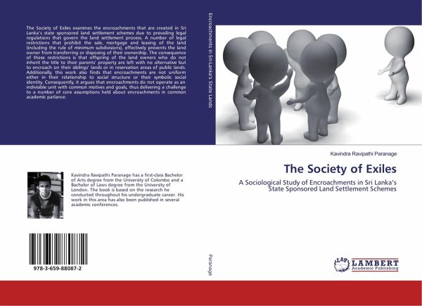 The Society of Exiles examines the encroachments that are created in Sri Lanka's state sponsored land settlement schemes due to prevailing legal regulations that govern the land settlement process. A number of legal restrictions that prohibit the sale, mortgage and leasing of the land (including the rule of minimum subdivisions), effectively prevents the land owner from transferring or disposing of their ownership. The consequence of these restrictions is that offspring of the land owners who do not inherit the title to their parents' property are left with no alternative but to encroach on their siblings' lands or in reservation areas of public lands. Additionally, this work also finds that encroachments are not uniform either in their relationship to social structure or their symbolic social identity. Consequently, it argues that encroachments do not operate as an indivisible unit with common motives and goals, thus delivering a challenge to a number of core assumptions held about encroachments in common academic parlance.