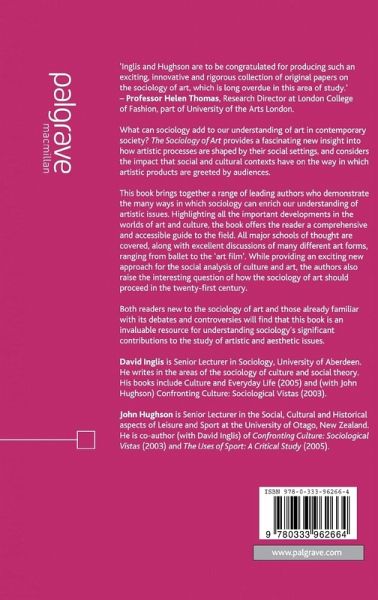 PART 1: THEORY PAST, PRESENT AND FUTURE What is the 'Sociology of Art'?; D.Inglis and J.Hughson When Does Art Become Art? Assessing Pierre Bourdieu's Theory of Artistic Fields; J.Jane Feminist Art and Feminist Sociology: New Departures; A.Howson A New Paradigm for a Sociology of Aesthetics; R.Witkin Invisible Aesthetics and the Social Work of Community Culture; P.Willis Cultural Studies and the Sociology of Culture; J.Wolff The Sociology of Art: Cynical or Celebratory?; D. Inglis PART 2: FROM THEORY TO PRACTICE: CASE STUDIES IN THE SOCIOLOGY OF ART Framing Old Age: Sociological Perspectives on the Art of the Past; M.Hepworth The Rise and Fall of the Art House Movie; A.Tudor Opera, Modernity and Cultural Fields; A.Swingewood 'World Music' and the Globalisation of Sound; R.Robertson and D.Inglis 'High Arts' and the Market: An Uneasy Partnership in the Transnational World of Ballet; H.Wulff Reconstructing the Centre: Sociological Approaches to the Rebuilding of Berlin; J.Stewart.