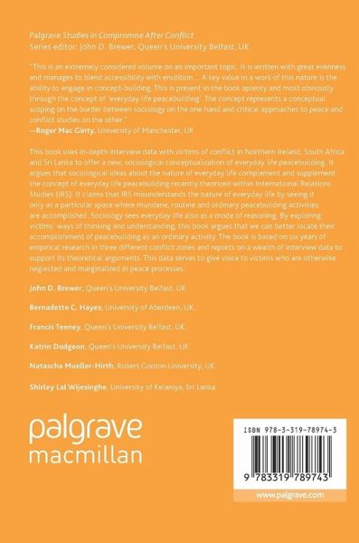 This book uses in-depth interview data with victims of conflict in Northern Ireland, South Africa and Sri Lanka to offer a new, sociological conceptualization of everyday life peacebuilding. It argues that sociological ideas about the nature of everyday life complement and supplement the concept of everyday life peacebuilding recently theorized within International Relations Studies (IRS). It claims that IRS misunderstands the nature of everyday life by seeing it only as a particular space where mundane, routine and ordinary peacebuilding activities are accomplished. Sociology sees everyday life also as a mode of reasoning. By exploring victims' ways of thinking and understanding, this book argues that we can better locate their accomplishment of peacebuilding as an ordinary activity. The book is based on six years of empirical research in three different conflict zones and reports on a wealth of interview data to support its theoretical arguments. This data serves togive voice to victims who are otherwise neglected and marginalized in peace processes.