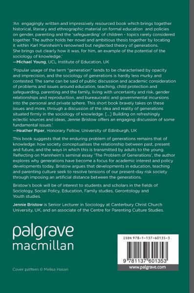 This book suggests that the enduring problem of generations remains that of knowledge: how society conceptualises the relationship between past, present and future, and the ways in which this is transmitted by adults to the young. Reflecting on Mannheim's seminal essay 'The Problem of Generations', the author explores why generations have become a focus for academic interest and policy developments today. Bristow argues that developments in education, teaching and parenting culture seek to resolve tensions of our present-day risk society through imposing an artificial distance between the generations.