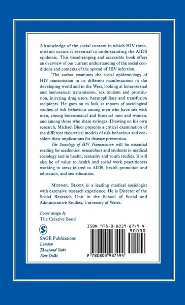 Examining the social epidemiology of HIV transmission, Bloor looks at heterosexual and homosexual transmission, sex tourism and prostitution, injecting drug users, haemophiliacs and transfusion recipients. Bloor presents a critical examination of the different theoretical models of risk and considers their implications for disease prevention.