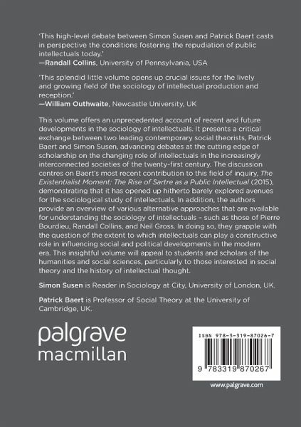 Introduction: Key Issues in the Sociology of Intellectuals; Simon Susen and Patrick Baert.- Chapter 1: Reflections on Patrick Baert's The Existentialist Moment: The Rise of Sartre as a Public Intellectual; Simon Susen.- Chapter 2: The Existentialist Moment Defended: A Reply to Simon Susen; Patrick Baert.