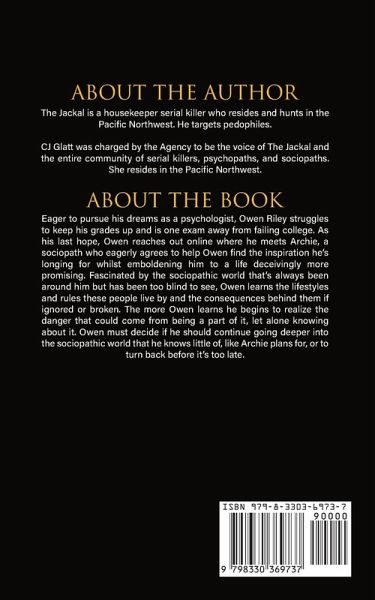 Eager to pursue his dreams as a psychologist, Owen Riley struggles to keep his grades up and is one exam away from failing college. As his last hope, Owen reaches out online where he meets Archie, a sociopath who eagerly agrees to help Owen find the inspiration he is longing for whilst emboldening him to a life deceivingly more promising. Fascinated by the sociopathic world that's always been around him but has been to blind to see, Owen learns the lifestyles and rules these people live by and the consequences behind them if ignored or broken. The more Owen learns about the sociopathic world he begins to realize the danger that could come from being a part of it, let alone knowing about it. Owen must decide if he should continue going deeper into the sociopathic world that he knows little of, like Archie plans for, or to turn back before it's too late. This story is told by The Jackal, a serial killer from the PNW.