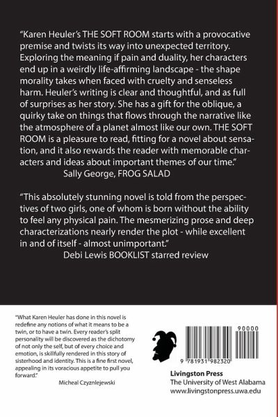 "Karen Heuler's THE SOFT ROOM starts with a provocative premise and twists its way into unexpected territory. Exploring the meaning of pain and duality, her characters end up in a weirdly life-affirming landscape-the shape morality takes when faced with cruelty and senseless harm. Heuler's writing is clear and thoughtful, and as full of surprises as her story. She has a gift for the oblique, a quirky take on things that flows through the narrative like the atmosphere of a planet almost like our own. THE SOFT ROOM is a pleasure to read, fitting for a novel about sensation, and it also rewards the reader with memorable characters and ideas about important themes of our time." -Sally George, FROG SALAD "This absolutely stunning novel is told from the perspectives of twin girls, one of whom is born without the ability to feel any physical pain. The mesmerizing prose and deep characterizations nearly render the plot-while excellent in and of itself-almost unimportant." -Debi Lewis, BOOKLIST starred review ,!7IB9D1-jicdca!:P;l;o;T;p ISBN