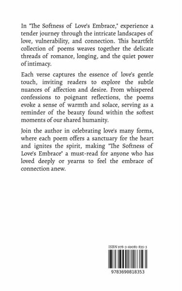 In "The Softness of Love's Embrace," experience a tender journey through the intricate landscapes of love, vulnerability, and connection. This heartfelt collection of poems weaves together the delicate threads of romance, longing, and the quiet power of intimacy. Each verse captures the essence of love's gentle touch, inviting readers to explore the subtle nuances of affection and desire. From whispered confessions to poignant reflections, the poems evoke a sense of warmth and solace, serving as a reminder of the beauty found within the softest moments of our shared humanity. Join the author in celebrating love's many forms, where each poem offers a sanctuary for the heart and ignites the spirit, making "The Softness of Love's Embrace" a must-read for anyone who has loved deeply or yearns to feel the embrace of connection anew.