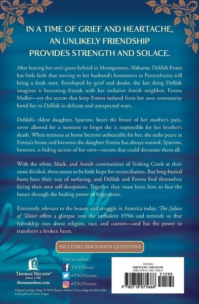 Award-winning author Elizabeth Byler Younts delivers a powerful novel of grief, friendship, and forgiveness filled with her signature lyricism and emotional depth. "Younts's powerful novel reverberates with love that crosses religious and racial boundaries to find the humanity that connects us all. Highly recommended." --Library Journal starred review In the turbulent 1950s, Delilah Evans leaves behind her son's grave in Alabama, hoping for a fresh start in her husband's Pennsylvania hometown. Instead, she finds herself drowning in sorrow and guilt--until an unlikely friendship blossoms with her reclusive Amish neighbor, Emma Mullet, who harbors secrets of her own. Meanwhile, Delilah's daughter, Sparrow, struggles under the weight of her mother's grief, finding solace in Emma's home even as she hides devastating secrets of her own. With the white, Black, and Amish communities of Sinking Creek at their most divided, there seems to be little hope for reconciliation. But long-buried hurts have their way of surfacing, and Delilah and Emma find themselves facing their own self-deceptions. Together they must learn how to face the future through the healing power of forgiveness. "Younts has set herself apart with this exquisite story of friendship and redemption . . . I'll be talking about this book for years to come." --Rachel Hauck, New York Times bestselling author of The Wedding Dress Set against the racial, cultural, and religious divides of small-town Pennsylvania, The Solace of Water is a moving portrait of loss, reconciliation, and the fragile beauty of human connection. This standalone historical novel includes discussion questions, making it a meaningful choice for book clubs and a memorable gift for readers of literary, hope-filled fiction.