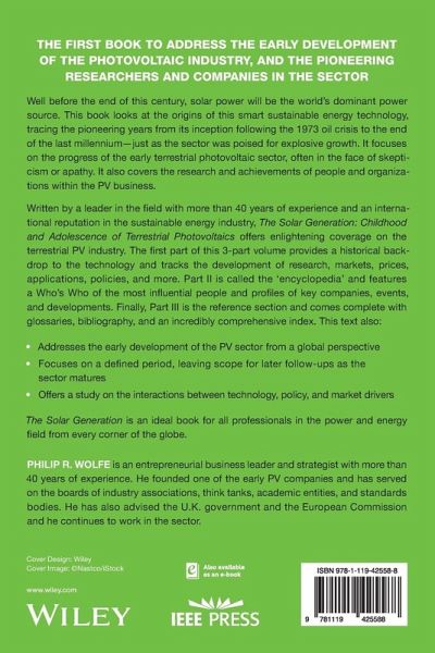The first book to address the early development of the photovoltaic industry, and the pioneering researchers and companies in the sector Well before the end of this century, solar power will be the world's dominant power source. This book looks at the origins of this smart sustainable energy technology, tracing the pioneering years from its inception following the 1973 oil crisis to the end of the last millennium-just as the sector was poised for explosive growth. It focuses on the progress of the early terrestrial photovoltaic sector, often in the face of skepticism or apathy. It also covers the research and achievements of people and organizations within the PV business. Written by a leader in the field with more than 40 years of experience and an international reputation in the sustainable energy industry, The Solar Generation: Childhood and Adolescence of Terrestrial Photovoltaics offers enlightening coverage on the terrestrial PV industry. The first part of this 3-volume set provides a historical backdrop to the technology and tracks the development of research, markets, prices, applications, policies, and more. Part II is called the 'encyclopedia' and features a Who's Who of the most influential people and profiles of key companies, events, and developments. Finally, Part III is the reference section and comes complete with glossaries, bibliography, and an incredibly comprehensive index. This text also: * Addresses the early development of the PV sector from a global perspective * Focuses on a defined period, leaving scope for later follow-ups as the sector matures * Offers a study on the interactions between technology, policy, and market drivers The Solar Generation is an ideal book for all professionals in the power and energy field from every corner of the globe.