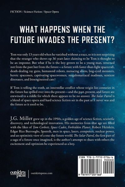 What happens when the future invades the present? Tom was only 13 years old when he vanished without a trace, so it is not surprising that the stranger who shows up 36 years later claiming to be Tom is thought to be an imposter. But what if he is the boy grown to be a young man, returned not from the past but from the future-a future with faster-than-light spacecraft, death-dealing ray guns, humanoid robots, menacing aliens, bug-eyed monsters, heroic spacemen, captivating spacewomen, megalomaniacal madmen, sentient dinosaurs, and bioengineered cats? If Tom is telling the truth, an interstellar conflict whose origin lies centuries in the future has spilled over into the present-and the past, present, and future are entwined in a riddle for which there appears to be no answer. The Solar Patrol is a blend of space opera and hard science fiction set in the past as it never was and the future as it used to be.