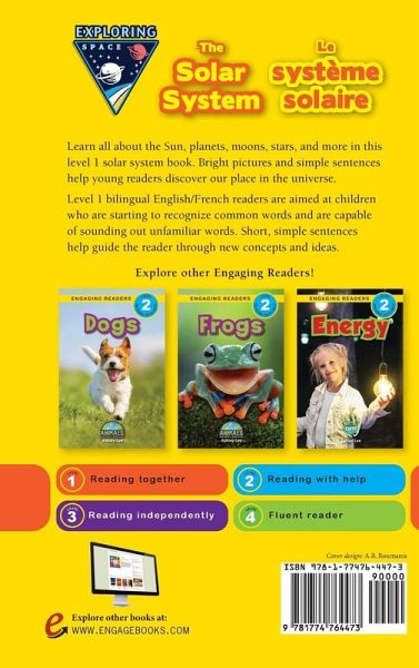Bilingual English/French Level 1 Reader for Kids! Learn all about the Sun, planets, moons, stars, and more in this level 1 solar system book. Bright pictures and simple sentences help young readers discover our place in the universe. Level 1 bilingual English/French (Anglais/Français) readers are aimed at children who are starting to recognize common words and are capable of sounding out unfamiliar words. Short, simple sentences help guide the reader through new concepts and ideas.