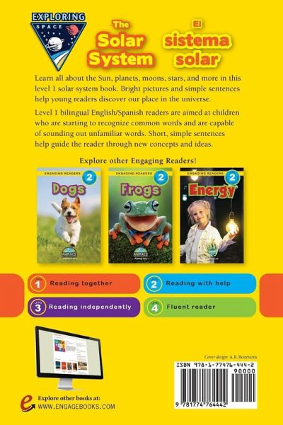 Bilingual English/Spanish Level 1 Reader for Kids! Learn all about the Sun, planets, moons, stars, and more in this level 1 solar system book. Bright pictures and simple sentences help young readers discover our place in the universe. Level 1 bilingual English/Spanish (Inglés/Español) readers are aimed at children who are starting to recognize common words and are capable of sounding out unfamiliar words. Short, simple sentences help guide the reader through new concepts and ideas.
