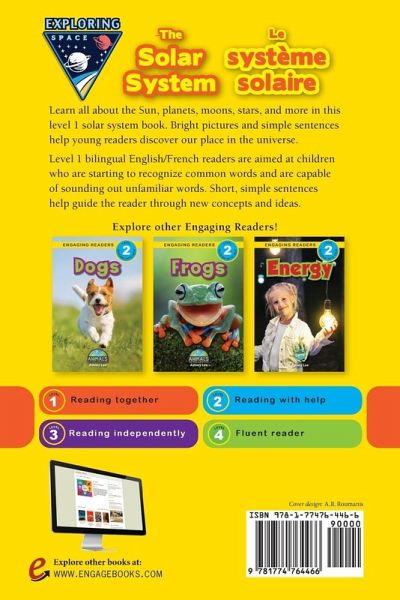 Bilingual English/French Level 1 Reader for Kids! Learn all about the Sun, planets, moons, stars, and more in this level 1 solar system book. Bright pictures and simple sentences help young readers discover our place in the universe. Level 1 bilingual English/French (Anglais/Français) readers are aimed at children who are starting to recognize common words and are capable of sounding out unfamiliar words. Short, simple sentences help guide the reader through new concepts and ideas.