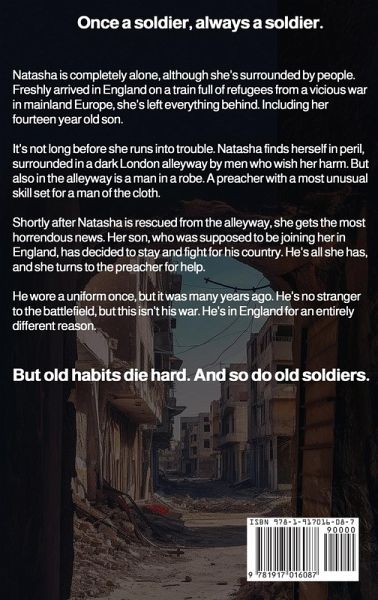 Once a soldier, always a soldier. ¿ Natasha is completely alone, although she's surrounded by people. Freshly arrived in England on a train full of refugees from a vicious war in mainland Europe, she's left everything behind. Including her fourteen year old son. It's not long before she runs into trouble. Natasha finds herself in peril, surrounded in a dark London alleyway by men who wish her harm. But also in the alleyway is a man in a robe. A preacher with a most unusual skill set for a man of the cloth. Shortly after Natasha is rescued from the alleyway, she gets the most horrendous news. Her son, who was supposed to be joining her in England, has decided to stay and fight for his country. He's all she has, and she turns to the preacher for help. He wore a uniform once, but it was many years ago. He's no stranger to the battlefield, but this isn't his war. He's in England for an entirely different reason. But old habits die hard. And so do old soldiers.