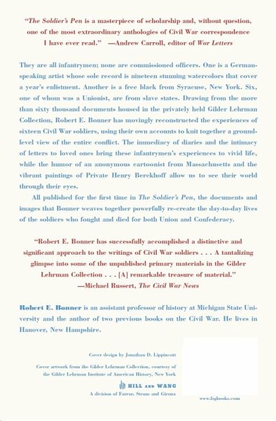 They are all infantrymen; none were commissioned officers. One is a German-speaking artist whose sole record is nineteen stunning watercolors that cover a year's enlistment. Another is a free black from Syracuse, New York. Six are from slave states, one of whom was a Unionist. Drawing from the more than 60,000 documents housed in the privately held Gilder Lehrman Collection, Robert E. Bonner has movingly reconstructed the experiences of sixteen Civil War soldiers, using their own accounts to knit together a ground-level view of the entire conflict. The immediacy of diaries and the intimacy of letters to loved ones accompany the humor of an anonymous cartoonist from Massachusetts, the vivid paintings of Private Henry Berckhoff. All reproduced for the first time in The Soldier's Pen, the documents and images that Bonner weaves together, providing context and explanation as required, powerfully re-create the day-to-day lives of the soldiers who fought and died for Union and Confederacy. Not since the 2000 publication of Robert Sneden's paintings and papers in Eye of the Storm has a collection of original Civil War documents so evocatively captured the war.