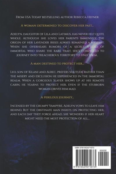 From USA Today bestselling author Rebecca Hefner A woman determined to discover her past... Adelyn, daughter of Lila and Latimus, has never felt quite whole. Although she loves her parents immensely, the origin of her lavender irises always remained a mystery. When she overhears rumors of a secret species of immortal who share the rare trait, she's compelled to journey into treacherous territory to find them. A man destined to protect her... Leo, son of Kilani and Alrec, prefers solitude rather than the misery and exclusion he experienced in the immortal realm. When a gorgeous Slayer shows up at his remote cabin, he yearns to protect her, even if the stubborn woman drives him mad. A perilous journey... Incensed by the grumpy Vampyre, Adelyn vows to leave him behind. But the obstinate man insists on protecting her, and each day they forge ahead, she wonders if her heart might need the most protection of all... Grumpy-sunshine, forced proximity romance lovers-this one's for you! For everyone who enjoyed The Dawn of Peace, Kilani and Alrec are back as their son experiences his own love story! Enjoy and happy reading! Content information can be found on the author's website.