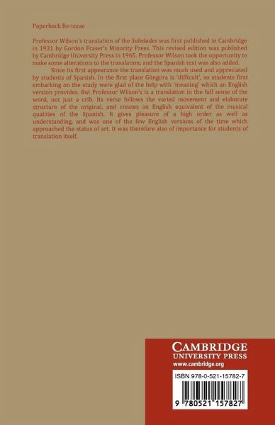 Professor Wilson's translation of the Soleades was first published in Cambridge in 1931 by Gordon Fraser's Minority Press. This revised edition, with the Spanish text added, was published by Cambridge University Press in 1965. In the first place, Góngora is 'difficult', and therefore, fifty students first embarking on the study were glad of the help with 'meaning' which an English version provides. But Professor Wilson's is a translation in the full sense of the word, not just a crib. Its verse follows the varied movement and elaborate structure of the original, and creates an English equivalent of the musical qualities of the Spanish. It gives pleasure of a high order as well as understanding, and was one of the few English versions of the time which approached the status of art. It was therefore of importance for students of translation itself.