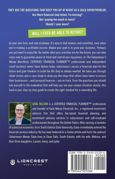 They are the questions that keep you up at night as a solo entrepreneur: Are there financial land mines I'm missing? Am I paying too much in taxes? Should I save more? Will I ever be able to retire? As your own boss and sole employee, it's easy to feel anxious and unsettled, even when you're making a profitable income. Maybe your goal is to grow your business. Perhaps you just want to enjoy life. No matter what your priorities are for the future, you can take steps now to guarantee peace of mind and control your happiness. In The Solopreneur's Money Manifesto, CERTIFIED FINANCIAL PLANNER(TM) professional and independent small business owner Gabe Nelson helps solopreneurs secure a financial plan for the future and gain freedom to build the life they've always wanted. He takes you through client stories and a case study to show you the steps that others have taken to ensure their business-and personal finances-are on track. From the questions you should ask yourself to the evaluation that will help you see your unique situation clearly, this book is your step-by-step guide to create the right mindset for a rewarding life.