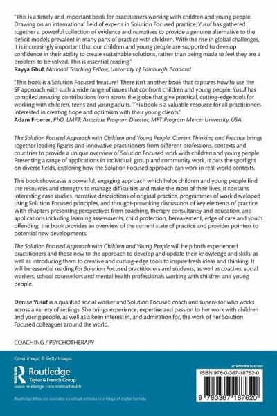 "This is a timely and important book for practitioners working with children and young people. Drawing on an international field of experts in Solution Focused Practice, Yusuf has gathered together a powerful collection of evidence and narratives to provide a genuine alternative to the deficit models prevalent in many parts of practice with children. With the rise in global challenges, it is increasingly important that our children and young people are supported to develop confidence in their ability to create sustainable solutions, rather than being made to feel they are a problem to be solved. This is essential reading." - Rayya Ghul, National Teaching Fellow, University of Edinburgh, Scotland