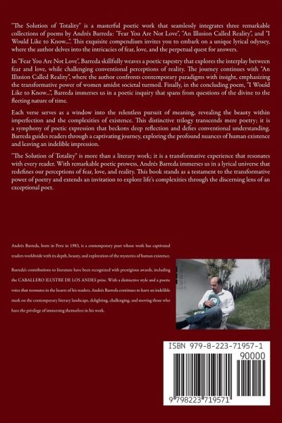 "The Solution of Totality" is a masterful poetic work that seamlessly integrates three remarkable collections of poems by Andrés Barreda: "Fear You Are Not Love", "An Illusion Called Reality", and "I Would Like to Know...". This exquisite compendium invites you to embark on a unique lyrical odyssey, where the author delves into the intricacies of fear, love, and the perpetual quest for answers. In "Fear You Are Not Love", Barreda skillfully weaves a poetic tapestry that explores the interplay between fear and love, while challenging conventional perceptions of reality. The journey continues with "An Illusion Called Reality", where the author confronts contemporary paradigms with insight, emphasizing the transformative power of women amidst societal turmoil. Finally, in the concluding poem, "I Would Like to Know...", Barreda immerses us in a poetic inquiry that spans from questions of the divine to the fleeting nature of time. Each verse serves as a window into the relentless pursuit of meaning, revealing the beauty within imperfection and the complexities of existence. This distinctive trilogy transcends mere poetry; it is a symphony of poetic expression that beckons deep reflection and defies conventional understanding. Barreda guides readers through a captivating journey, exploring the profound nuances of human existence and leaving an indelible impression. "The Solution of Totality" is more than a literary work; it is a transformative experience that resonates with every reader. With remarkable poetic prowess, Andrés Barreda immerses us in a lyrical universe that redefines our perceptions of fear, love, and reality. This book stands as a testament to the transformative power of poetry and extends an invitation to explore life's complexities through the discerning lens of an exceptional poet.