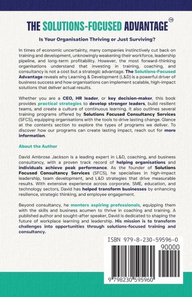 Introducing: The Solutions Focused Advantage: Transforming People, Performance, and Profitability.Have you ever wondered how some organizations consistently outperform others? Is your leadership team equipped to navigate the complexities of today's business environment? Are your teams operating at their highest potential, driving innovation and growth? Could a strategic investment in your people be the key to unlocking unprecedented profitability? If these questions resonate with you, then "The Solutions Focused Advantage" is your essential guide. In today's rapidly evolving business landscape, organisations face the critical challenge of fostering leadership, enhancing team dynamics, and achieving sustainable growth. "The Solutions Focused Advantage" explores the transformative power of investing in people, illustrating how this strategic approach yields stronger leaders, more innovative teams, enhanced profitability, and sustainable growth. Key Features:Leadership Development: Discover strategies to cultivate leaders who inspire, motivate, and drive organisational success.¿ Team Optimization: Learn techniques to build cohesive, high-performing teams that adapt and thrive in changing environments.¿ Sustainable Growth: Understand the correlation between employee investment and long-term business prosperity.¿ Practical Insights: Access real-world examples and actionable advice to implement solutions-focused methodologies within your organisation.¿ Whether you're a CEO, senior business leader, HR professional, or someone passionate about organisational development, "The Solutions Focused Advantage" offers valuable insights into harnessing the potential of your people to achieve remarkable outcomes.¿ Embark on a journey to transform your organisation's culture and performance by placing people at the heart of your strategy.