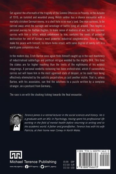 Set against the aftermath of the tragedy of the Somme Offensive in Picardy, in the Autumn of 1916, an isolated and wounded young Welsh soldier has a chance encounter with a mortally stricken German enemy, in a shell hole in no-man's land. One man survives, to be carried away amid the carnage and wreckage of battle lying all around. Thus begins a personal journey for Nathan Hughes, to make sense of madness of war, but this survivor carries with him a letter, which unbeknown to him, contains the seeds of potential destruction for one of Europe's most powerful industrial conglomerates. First he must make his peace with himself, to return home intact, with some degree of sanity left in a world gone completely mad... In the modern day, Erich Barton once again finds himself caught up in the vast machinery of industrialised subterfuge and political intrigue wielded by the mighty BFK. This time the stakes are far higher reaching than the limits of the nightmares of his wildest imaginings. A personal vendetta reckoning has been orchestrated, which if successfully carries out will leave him in the most agonised state of despair, or he could face being effectively eliminated by the sadistic perpetrators as just another victim. That is, unless Barton, with his associates, can find the solutions to a puzzle written by a complete stranger, on a postcard from Germany... The race is on with the clocking ticking towards the final encounter.