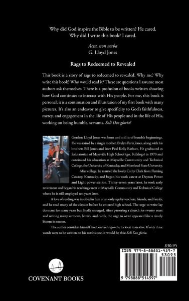 Why did God inspire the Bible to be written? He cared. Why did I write this book? I cared. Acta, non verba G. Lloyd Jones Rags to Redeemed to Revealed This book is a story of rags to redeemed to revealed. Why me? Why write this book? Who would read it? These are questions I assume most authors ask themselves. There is a profusion of books written showing how God continues to interact with His people. For me, this book is personal; it is a continuation and illustration of my first book with many pictures. It's also an endeavor to give specificity to God's faithfulness, mercy, and engagement in the life of His people and in the life of His, working on being humble, servants. Soli Deo gloria!