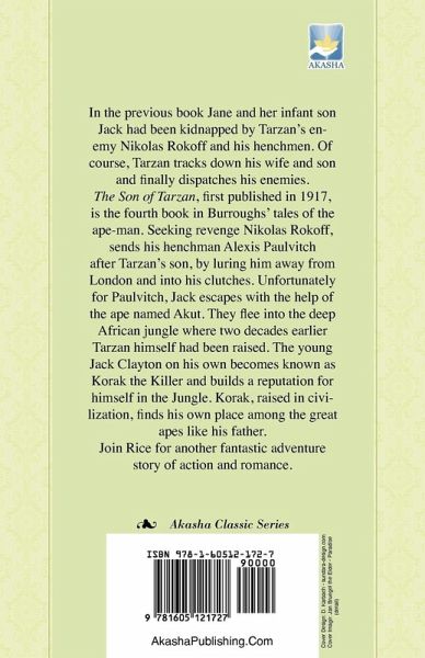 In the previous book Jane and her infant son Jack had been kidnapped by Tarzan¿s enemy Nikolas Rokoff and his henchmen. Of course, Tarzan tracks down his wife and son and finally dispatches his enemies. The Son of Tarzan, first published in 1917, is the fourth book in Burroughs¿ tales of the ape-man. Seeking revenge Nikolas Rokoff, sends his henchman Alexis Paulvitch after Tarzan¿s son, by luring him away from London and into his clutches. Unfortunately for Paulvitch, Jack escapes with the help of the ape named Akut. They flee into the deep African jungle where two decades earlier Tarzan himself had been raised. The young Jack Clayton on his own becomes known as Korak the Killer and builds a reputation for himself in the Jungle. Korak, raised in civilization, finds his own place among the great apes like his father. Join Rice for another fantastic adventure story of action and romance.
