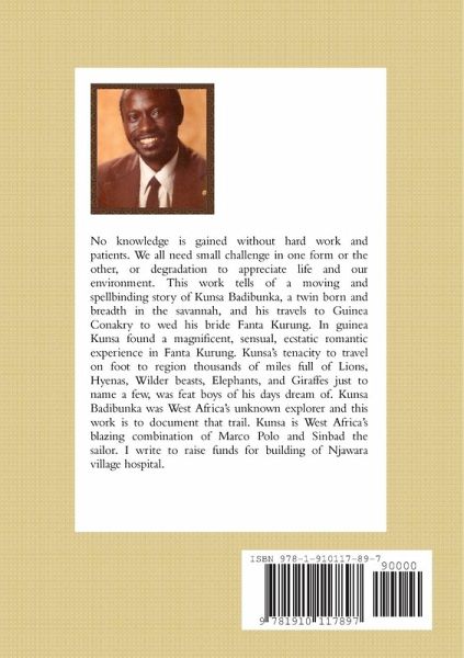 No knowledge is gained without hard work and patients. We all need small challenge in one form or the other, or degradation to appreciate life and our environment. This work tells of a moving and spellbinding story of Kunsa Badibunka, a twin born and breadth in the savannah, and his travels to Guinea Conakry to wed his bride Fanta Kurung. In guinea Kunsa found a magnificent, sensual, ecstatic romantic experience in Fanta Kurung. Kunsa's tenacity to travel on foot to region thousands of miles full of Lions, Hyenas, Wilder beasts, Elephants, and Giraffes just to name a few, was feat boys of his days dream of. Kunsa Badibunka was West Africa's unknown explorer and this work is to document that trail. Kunsa is West Africa's blazing combination of Marco Polo and Sinbad the sailor. I write to raise funds for building of Njawara village hospital.