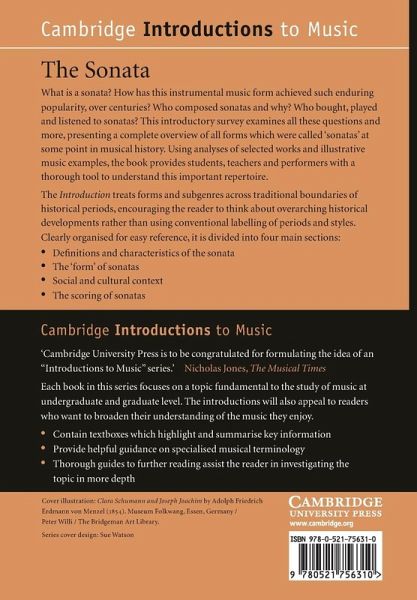 What is a sonata? Literally translated, it simply means 'instrumental piece'. It is the epitome of instrumental music, and is certainly the oldest and most enduring form of 'pure' and independent instrumental composition, beginning around 1600 and lasting to the present day. Schmidt-Beste analyses key aspects of the genre including form, scoring and its social context - who composed, played and listened to sonatas? In giving a comprehensive overview of all forms of music which were called 'sonatas' at some point in musical history, this book is more about change than about consistency - an ensemble sonata by Gabrieli appears to share little with a Beethoven sonata, or a trio sonata by Corelli with one of Boulez's piano sonatas, apart from the generic designation. However, common features do emerge, and the look across the centuries - never before addressed in a single-volume survey - opens up new and significant perspectives.
