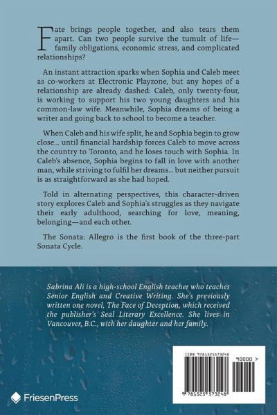 Fate brings people together, and also tears them apart. Can two people survive the tumult of life-family obligations, economic stress, and complicated relationships? An instant attraction sparks when Sophia and Caleb meet as co-workers at Electronic Playzone, but any hopes of a relationship are already dashed: Caleb, only twenty-four, is working to support his two young daughters and his common-law wife. Meanwhile, Sophia dreams of being a writer and going back to school to become a teacher. When Caleb and his wife split, he and Sophia begin to grow close... until financial hardship forces Caleb to move across the country to Toronto, and he loses touch with Sophia. In Caleb's absence, Sophia begins to fall in love with another man, while striving to fulfil her dreams... but neither pursuit is as straightforward as she had hoped. Told in alternating perspectives, this character-driven story explores Caleb and Sophia's struggles as they navigate their early adulthood, searching for love, meaning, belonging-and each other. The Sonata: Allegro is the first book of the three-part Sonata Cycle.