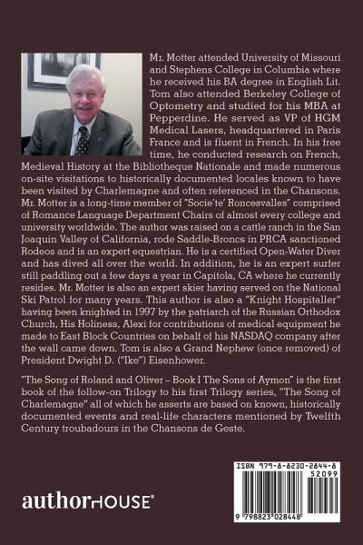 Mr. Motter attended University of Missouri and Stephens College in Columbia where he received his BA degree in English Lit. Tom also attended Berkeley College of Optometry and studied for his MBA at Pepperdine. He served as VP of HGM Medical Lasers, headquartered in Paris France and is fluent in French. In his free time, he conducted research on French, Medieval History at the Bibliotheque Nationale and made numerous on-site visitations to historically documented locales known to have been visited by Charlemagne and often referenced in the Chansons. Mr. Motter is a long-time member of "Socie'te' Roncesvalles" comprised of Romance Language Department Chairs of almost every college and university worldwide. The author was raised on a cattle ranch in the San Joaquin Valley of California, rode Saddle-Broncs in PRCA sanctioned Rodeos and is an expert equestrian. He is a certified Open-Water Diver and has dived all over the world. In addition, he is an expert surfer still paddling out a few days a year in Capitola, CA where he currently resides. Mr. Motter is also an expert skier having served on the National Ski Patrol for many years. This author is also a "Knight Hospitaller" having been knighted in 1997 by the patriarch of the Russian Orthodox Church, His Holiness, Alexi for contributions of medical equipment he made to East Block Countries on behalf of his NASDAQ company after the wall came down. Tom is also a Grand Nephew (once removed) of President Dwight D. ("Ike") Eisenhower. "The Song of Roland and Oliver - Book I The Sons of Aymon" is the first book of the follow-on Trilogy to his first Trilogy series, "The Song of Charlemagne" all of which he asserts are based on known, historically documented events and real-life characters mentioned by Twelfth Century troubadours in the Chansons de Geste.