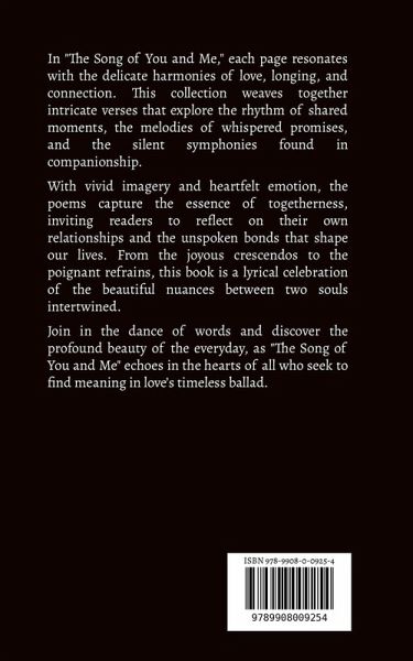 In "The Song of You and Me," each page resonates with the delicate harmonies of love, longing, and connection. This collection weaves together intricate verses that explore the rhythm of shared moments, the melodies of whispered promises, and the silent symphonies found in companionship. With vivid imagery and heartfelt emotion, the poems capture the essence of togetherness, inviting readers to reflect on their own relationships and the unspoken bonds that shape our lives. From the joyous crescendos to the poignant refrains, this book is a lyrical celebration of the beautiful nuances between two souls intertwined. Join in the dance of words and discover the profound beauty of the everyday, as "The Song of You and Me" echoes in the hearts of all who seek to find meaning in love's timeless ballad.