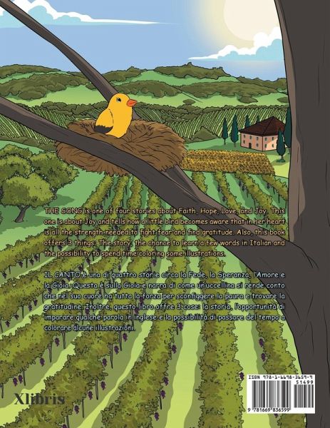THE SONG is one of four stories about Faith, Hope, Love, and Joy. This one is about Joy and tells how a little bird becomes aware that in her heart is all the strength needed to fight fear and find gratitude. Also, this book offers 3 things: The story, the chance to learn a few words in Italian and the possibility to spend time coloring some illustrations. IL CANTO è una di quattro storie circa la Fede, la Speranza, l'Amore e la Gioia. Questa è sulla Gioia e narra di come un'uccellina si rende conto che nel suo cuore ha tutta la forza per sconfiggere la paura e trovare la gratitudine. Inoltre, questo libro offre 3 cose: la storia, l'opportunità di imparare qualche parola in inglese e la possibilità di passare del tempo a colorare alcune illustrazioni.