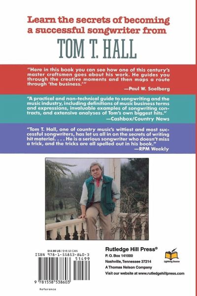 "I remember when I first got to Nashville," says Tom T. Hall. "I would have like to have had a book like this. It would have saved me a lot of time finding answers to questions." To help other songwriters, Tom T. Hall has put the answers in this book. "Songwriting is as much a craft as it is a talent," he says. "In order to write songs, you have to be able to recognize what a song is. You have to recognize the importance of something that is entertaining, and you have to say what you want to say very briefly." In this down-to-earth handbook, the Storyteller teaches the secrets of becoming a successful songwriter. Among the important topics treated are: What is a song and how will I know when I have one? How can I find edeas for songs? How do I combine words with music? What is the Nashville music industry really like? Definitions of terms and expressions used in the music business The Songwriter's Handbook also includes stories of how he wrote some of his own hits, such as "I Flew Over Our House Last Night," "Ravishing Ruby," "I See," and "Old Dogs, Children, and Watermelon Wine." He analyzes the songs, showing how he uses his own rules for successful songwriting. Included in the book are words and music to many of Tom T. Hall's most successful songs along with personal photos. An earlier version of The Songwriter's Handbook was published as How I Write Songs; Why You Can